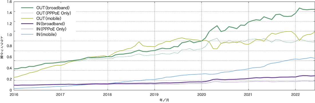 このように、ブロードバンドはPPPoE、IPoE共に全体の分布はほとんど変わっていません。一方で、PPPoEからIPoEへの移行が進んで、IPoE割合が増えているため、全体のトラフィック量は増えています。