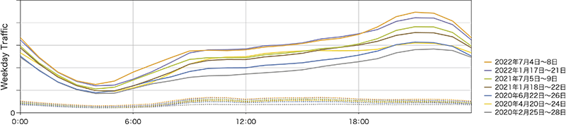 次に、コロナ禍の平日の時間別ブロードバンドトラフィック量の推移を見ていきます。ここでのトラフィック量はPPPoEとIPoEの合計値です。図-2に以下の7つの週のトラフィックを示します。2020年のコロナ禍の最初の変動を示すため、一斉休校が始まる前の2020年2月25日の週、最初の緊急事態宣言下の2020年4月20日の週、緊急事態解除後の2020年6月22日の週、そして、その後の変化を示すため、ほぼ半年間隔で、2021年1月18日の週と7月5日の週、2022年1月17日の週と7月4日の週を示しています。ここでは、各週の月曜から金曜の各時間の平均トラフィック量を示しています。下側の波線はそれぞれの週のアップロード量ですが、今回もダウンロード量に注目します。
