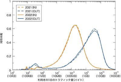 まず、図-3のブロードバンド(PPPoE)の分布を見ます。2021年と2022年を比較しても、INとOUT共に分布がほとんど変化していません。よく見ると、OUT側で僅かながら分布の山の部分が低くなっていて、その分、分布左側の中程が高くなっていることから、比較的利用量の少ないユーザの割合が若干増えたことが分かります。