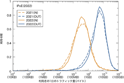 IPoEでは、表-2に示すように、PPPoEより大幅に利用量が多くなっています。これは、比較的利用量が多いユーザからIPoEに移行している、逆にいうと、利用量の少ないユーザの多くはPPPoEに留まっているからだと考えられます。2022年の最頻出値はINで398MB、OUTで6310MB、平均値はINで1007MB、OUTで7700MBです。2021年の最頻出値はINで447MB、OUTで6310MB、平均値はINで1110MB、OUTで7169MBでした。