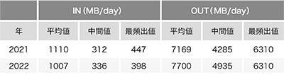 モバイルでは、表-3に示すように、すべての項目で増加しています。2022年の最頻出値はINで10MB、OUTで89MB、平均値はINで13MB、OUTで114MBです。2021年の最頻出値はINで8MB、OUTで71MB、平均値はINで10MB、OUTで86MBでした。