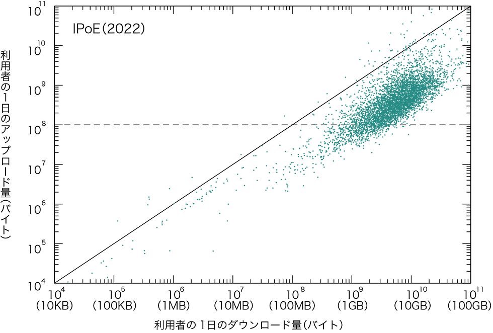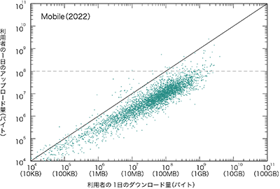 対角線の下側に対角線に沿って広がるクラスタは、ダウンロード量がひと桁多い一般的なユーザです。ブロードバンド(PPPoE)では、以前は右上の対角線上あたりを中心に薄く広がるヘビーユーザのクラスタがはっきり分かりましたが、今では識別ができなくなっています。また、各利用者の使用量やIN/OUT比率にも大きなばらつきがあり、多様な利用形態が存在することがうかがえます。IPoEでは、PPPoEに比べ利用者間のばらつきが少なく、利用量の少ないユーザ割合も小さいことが確認できます。モバイルでも、OUTがひと桁多い傾向は同じですが、ブロードバンドに比べて利用量は大幅に少なくなっています。ブロードバンド、モバイル共に、2021年との違いはほとんど分かりません。