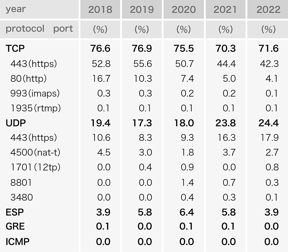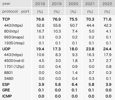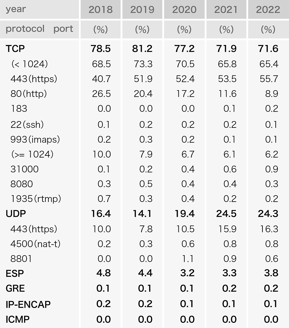 表-4はブロードバンド利用者のポート使用割合について過去5年間の推移を示します。2022年の全体トラフィックの72%はTCPで、昨年とほぼ同じです。HTTPSのTCP443番ポートの割合は、56%で前回から2ポイント増加しました。HTTPのTCP80番ポートの割合は12%から9%に減っています。QUICプロトコルで使われるUDP443番ポートは、16%でほぼ同じです。