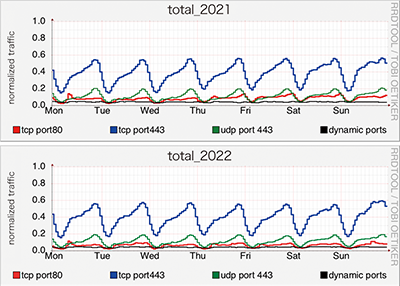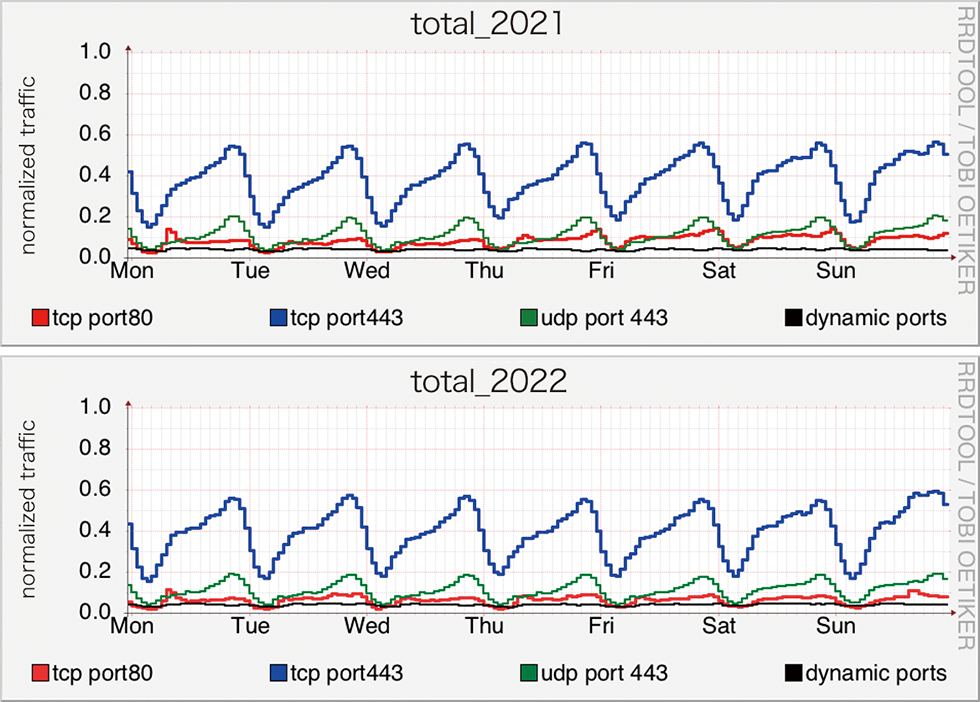 図-9は、ブロードバンド全体トラフィックにおける主要ポート利用の週間推移を、2021年と2022年で比較したものです。TCPポートの80番・443番・1024番以上の動的ポート、UDPポート443番の4つに分けてそれぞれの推移を示しています。グラフでは、ピーク時の総トラフィック量を1として正規化して表しています。全体のピークは19時~23時頃です。2021年と比較してもほとんど違いはなく、HTTPからHTTPSへの移行がほぼ一巡したと考えられます。