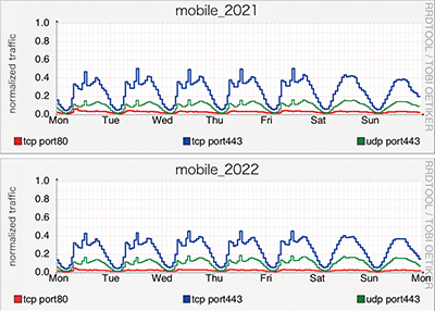 図-10のモバイルでは、トラフィックの大半を占めるTCP80番ポートと443番ポート、UDP443番ポートについて推移を示します。ここでも、2021年からの変化はほとんど見当たりません。ブロードバンドに比べると、朝から夜中までトラフィックの高い状態が続きます。平日には、朝の通勤時間、昼休み、夕方17時頃~22時頃にかけての3つのピークがあり、ブロードバンドとは利用時間の違いがあることが分かります。