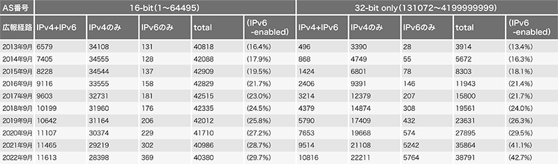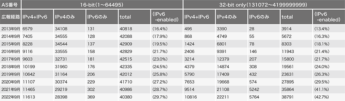 最後に「IPv4/IPv6フルルート」広報元AS(Origin AS)数を確認します(表-4)。なおこの1年の間にAPNICに4094、LACNICに1024の32-bit only AS番号が追加割り振りされています。