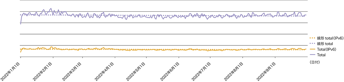 2022年はIPv6もIPv4も総じてトラフィックは横ばいとなりました。これまではIPv4でも数%、IPv6の場合は十数%の伸びを示していたので、横ばいとなるのはかなり珍しいように思います。ここ数年を振り返ると、2020年はコロナ影響による若干の停滞、2021年は反動による大きな増加となっていたため、今年は目立った傾向が出ていない状況なのかもしれません。