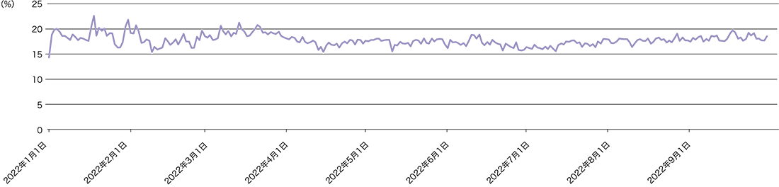 次に、トラフィック全体に占めるIPv6の比率を図-6に示します。年初は22%を超えることもありましたが、概ね16%から20%の間で推移しており、9ヵ月間の平均は17.8%となりました。