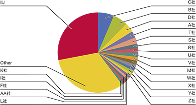 前回の本レポートVol.53(https://www.iij.ad.jp/dev/report/iir/053.html)で、日本の大手コンテンツ事業者であるA社がIPv6トラフィックの2位になったことを報告しましたが、今年はその事業者が占有率8.8%で1位となりました。2位は昨年まで連続して1位だったB社で7.9%、3位は昨年同様米国大手CDN事業者のC社で3.6%となっています。また、日本の大手コンテンツ事業者であるG社も1.7%+0.6%(事業別にASを複数所有している)で上位に食い込んできており、徐々に日本のコンテンツ事業者もIPv6への対応を進めていることがうかがえます。