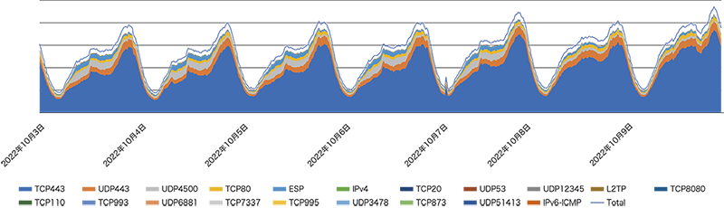 IPv6トラフィックのProtocol番号(Next-Header)と送信元ポート番号で解析したグラフを図-9に、IPv4トラフィックのProtocol番号と送信元ポート番号のグラフを図-10に示します。期間は2022年10月3日(月)から10月9日(日)までの1週間です。