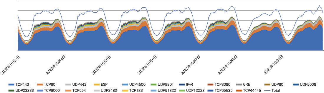 IPv6では、昨年3位だったESP(IPSec)が5位に後退し、昨年5位だったUDP4500(NAT Traversal IPSec)が3位となり、逆転した形となりました。IPv6でNATは基本的には使いませんが、NAT-Tのポートを使うのは実装を共通化する意図があるのでしょうか。なお、土日昼間はIPv6トラフィックも平日と比べ伸びていますが、ESPやUDP4500はかなり減っており、主にリモートワークなどの業務に利用されていることが想像できます。