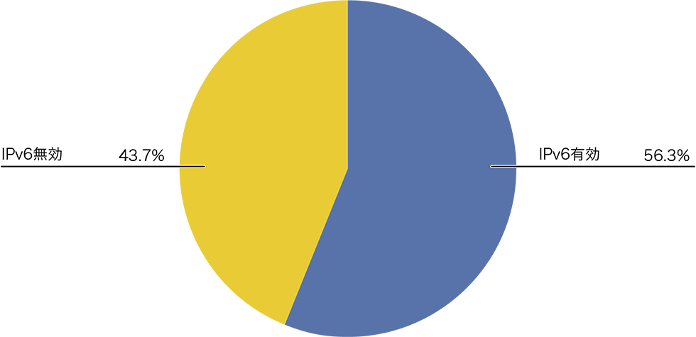 2019年の本レポートVol.45(https://www.iij.ad.jp/dev/report/iir/045.html)の中で、個人向けモバイルサービス(IIJmioモバイルサービス)の接続でIPv6有効・無効のそれぞれについて、モバイルOSによる違いがあるかの調査結果を紹介しました。当時IIJmioモバイル全体でIPv6有効:無効が48:52で、半数弱の接続でIPv6が有効になっていました。