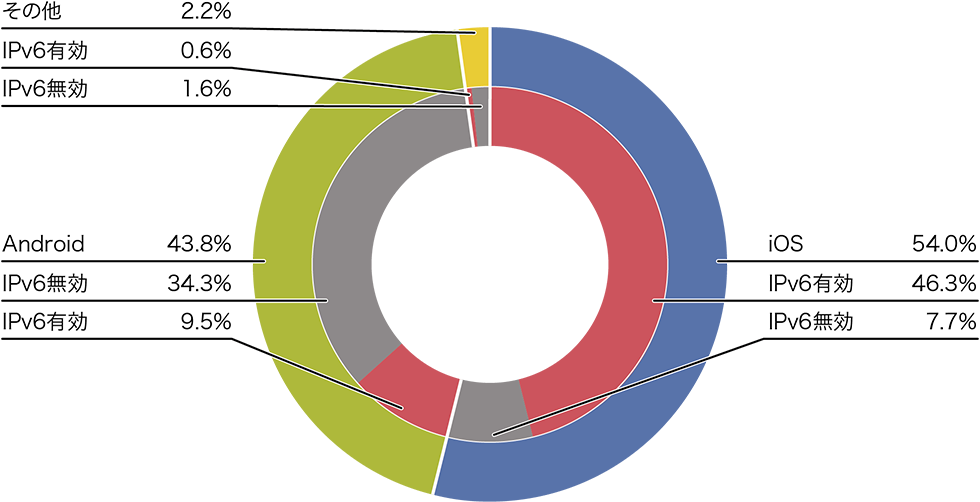 次にモバイルOS別のIPv6接続状況を見てみます。図-12の円グラフは、IIJmioモバイルサービスに接続していた端末の種別をIMEIの一部(TAC:先頭8桁)から、GSMAのデータベースの情報と突合して、Apple iOS(iPhoneやiPad)、Android、その他(モバイルルータやドングルなど)の3種類に分類し、IPv6接続状況を調査したものです。