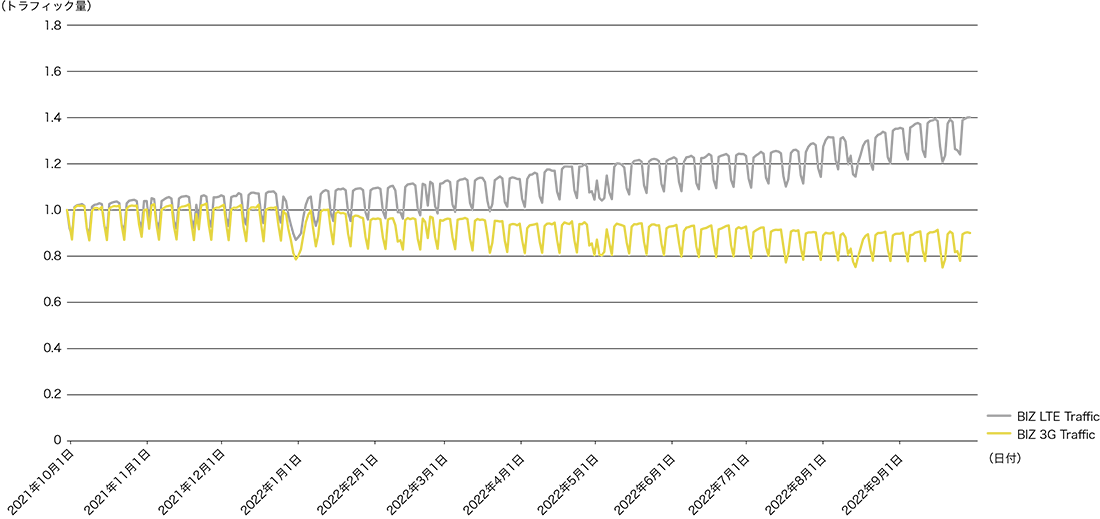 法人向けサービスにおいてはトラフィック傾向がお客様の3GからLTEへの移行計画の進捗に左右されることになります。モバイル設備担当としては、終了が見えている3G通信が減り、LTE通信が増加していくのは喜ばしいことですので、引き続き安定的な設備を提供しながら3G通信の減少を見守りたいと思っています。