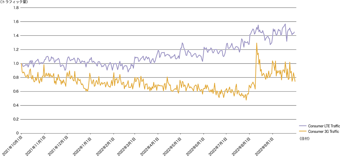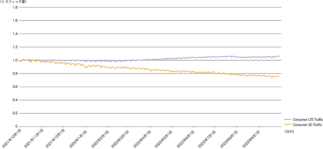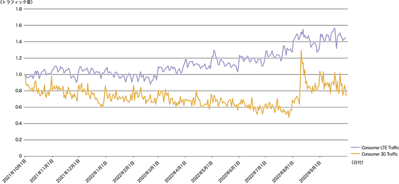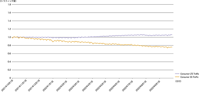トラフィック量に関してですが、LTEのトラフィック量に関しては徐々に増加する傾向が年間を通じて続いていますが、2022年6月以降は増加傾向が少しだけ加速しているように見えます。また、3Gのトラフィック量に関しては前述のとおり、2022年4月までは微減という状況でしたが、2022年5月以降は減少傾向が加速している状況です。