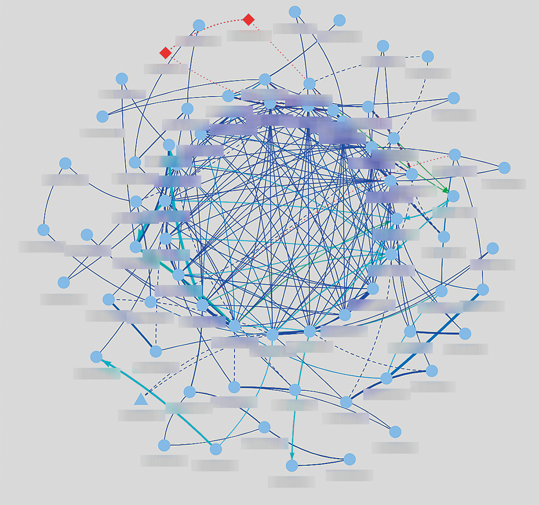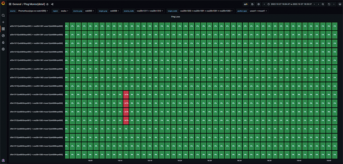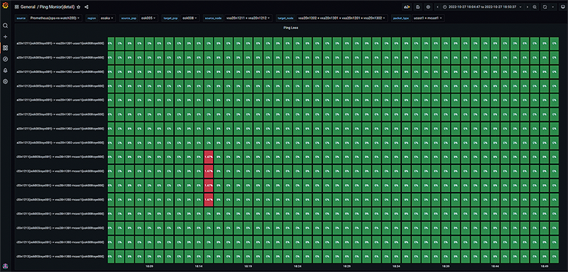 図-7はユーザ目線の監視のモニタリング画面です。時系列で各ノード間の通信状況が視覚的に分かるようになっています。画面上で赤色になっている箇所は実際にネットワークのメンテナンスを行った時間帯であり、一部通信に影響が出たことが分かります。また、特定のしきい値を下回った場合アラートがオペレーションセンターへ通知されます。