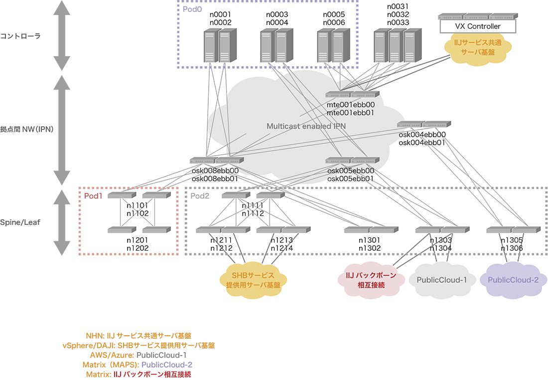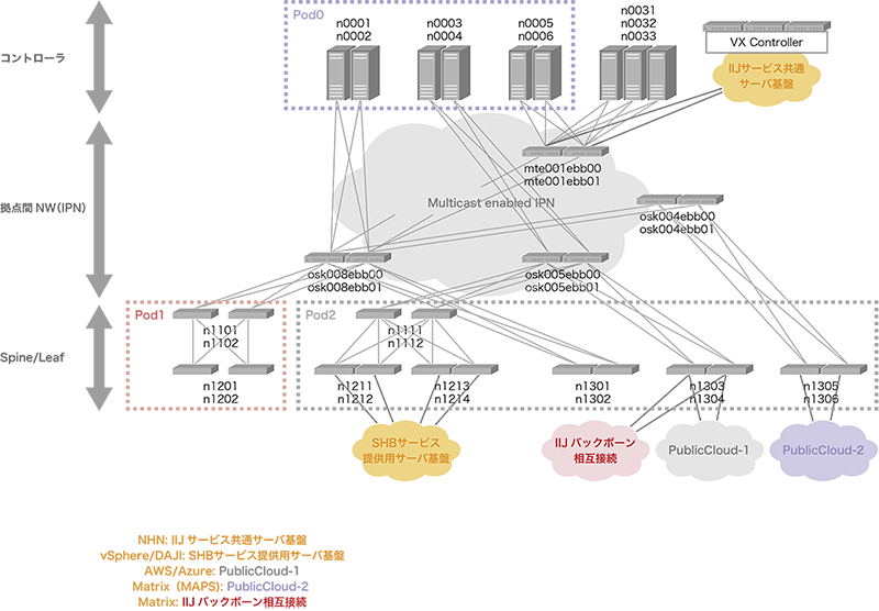 VXの狙いはIIJが様々なサービスをお客様へ素早く柔軟に提供するためのネットワーク基盤を実現することです。先に述べたように、広帯域で安定的なネットワークはもちろんのこと、IIJサービスをNFVとしてお客様に提供する際にもサービス設備からの需要に応えられるネットワーク基盤として検討しました。VXのコンセプトを実現するためにIIJバックボーンワークとして初めてネットワークコントローラを使ったSDNでの制御を導入しました。昨今のSDNはオープンソースを活用して一からすべて組み上げて実現することもできますが、VXの構築にあたっては普段から密に連携しているベンダーのソリューションを最大限活用する方法を選択しました。VXの初期基盤にはシスコシステムズ合同会社のデータセンター向けSDNソリューションであるCisco ACI (Application Centric Infrastructure)を採用しています。Cisco ACIはネットワークノードにNexusシリーズのレイヤー3スイッチを利用し、SDNコントローラであるAPIC(Application Policy Infrastructure Controller)から各ネットワーク構成をコントロールすることにより簡単にネットワークファブリックを構築することができます。もともとはデータセンター内のサーバネットワークとして一般的なReaf/Spine構成のIP-Closネットワークを簡単に実現するためのソリューションとしての位置づけですが、IIJではデータセンター内の利用にとどまらず、複数の拠点間でユーザを終端するPOP、NFVのサーバ基盤、そして外部パブリッククラウド間を相互接続するネットワークとしてカスタマイズしながら利用しています。