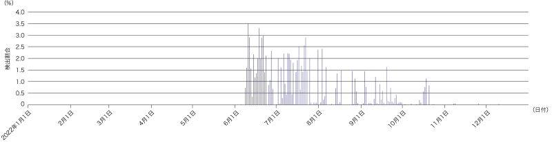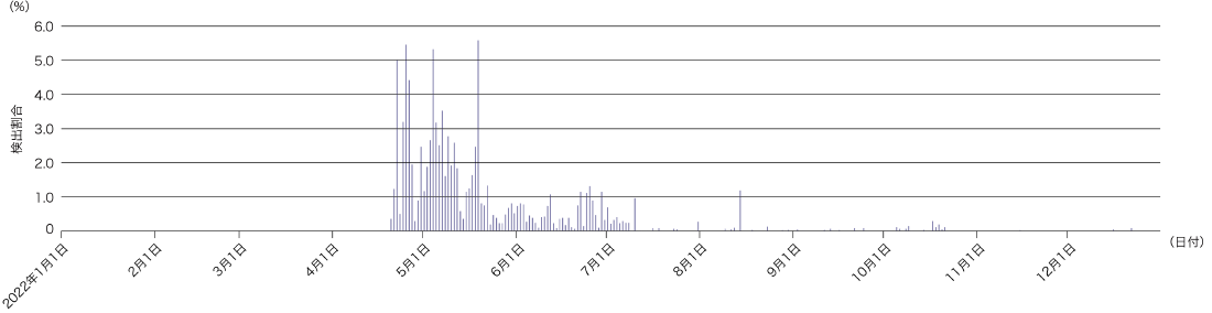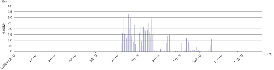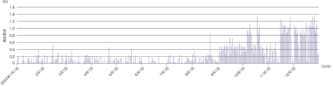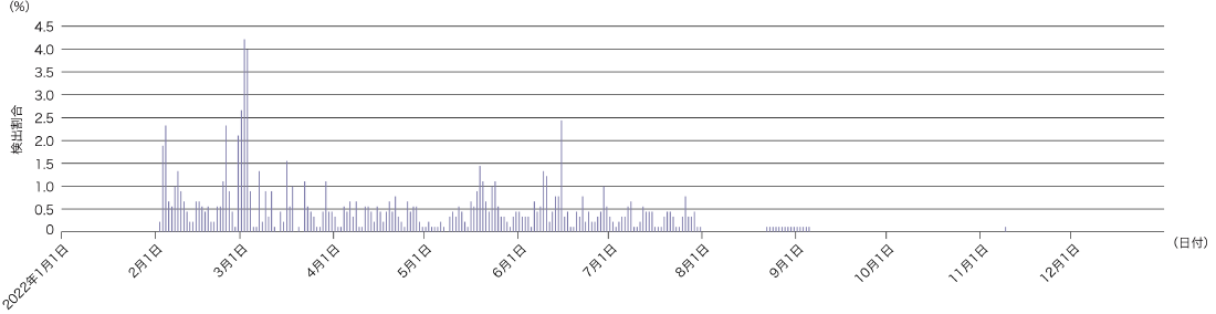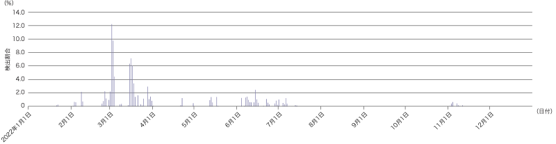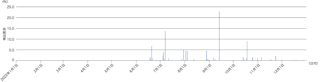 図-1では1年間におけるEmotetのメール件数の推移を示します。図の横軸は日付を、縦軸は対象期間における合計検出数を100%として正規化した割合を表します。
