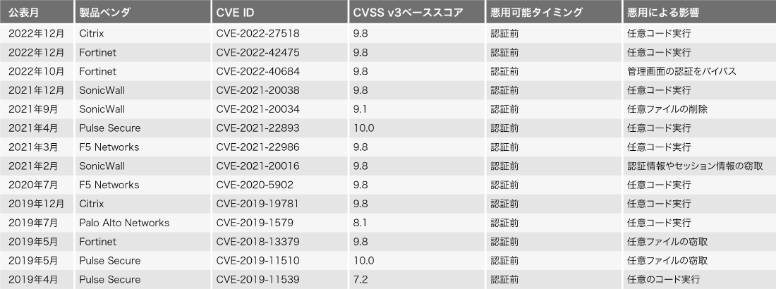 表-3 VPN機器に関連する主な脆弱性(2018~2022年)