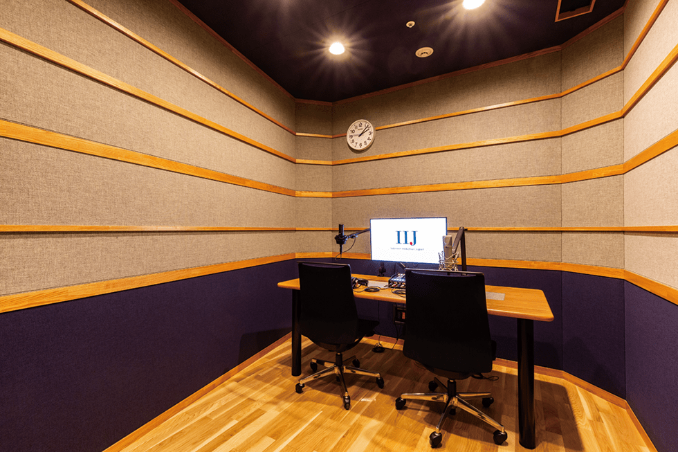 IIJ Studio TOKYOには音声収録専用の部屋があります。スタジオでの収録に合わせてナレーションを入れたり、ウェビナーなどの司会の音声を事前に収録することが可能です。音声収録に最適な環境を提供するため、床や壁の音の反響を抑えるよう考慮した作りになっています。既存の空調設備を専用ダクトに取り換えたり、入った瞬間に耳に入る音の質が変わるのが分かるほど部屋の形や吸音材の設置位置にも配慮しました。