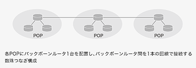 バックボーンはPOP(Point Of Presence)ごとに1台のバックボーンルータを設置し1本の専用線でPOP間を数珠つなぎに結ぶシングル構成から始まります。