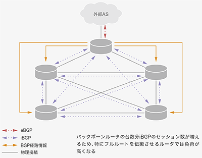 IIJバックボーンにおける経路設計はEGPによってどこにネットワークが存在するかを伝搬させ、IGPによって目的のネットワークまでの通信経路を制御するという基本方針をもとに、シンプルだが堅牢なネットワークの実現を念頭にデザインされています。当初はルータ数もインターネット上の全経路数(フルルート)も少なく、BGPも発展途上にあったことから必要最低限の機能しか実装されておらず、iBGPの構成はフルメッシュで組む形態が基本でした(図-3)。
