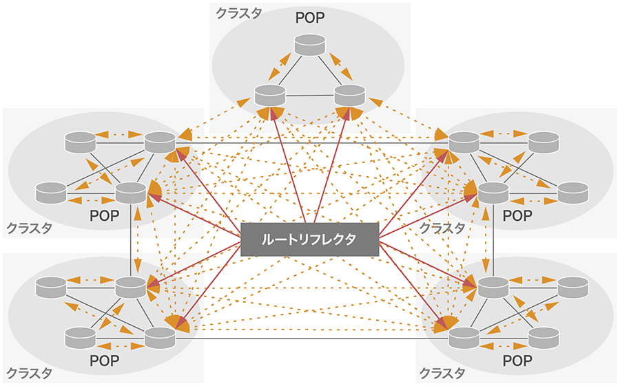 2001年頃よりブロードバンド接続が普及しトラフィック量も大幅に増えるとIIJバックボーンも更に増強・拡張が進みます。すぐに限界を迎えるのは明白だったためクラスタの細分化を行いPOPごとにクラスタを設ける構成へと移行しました(図-7)。現在もこの構成がベースとなり15年以上経過します。