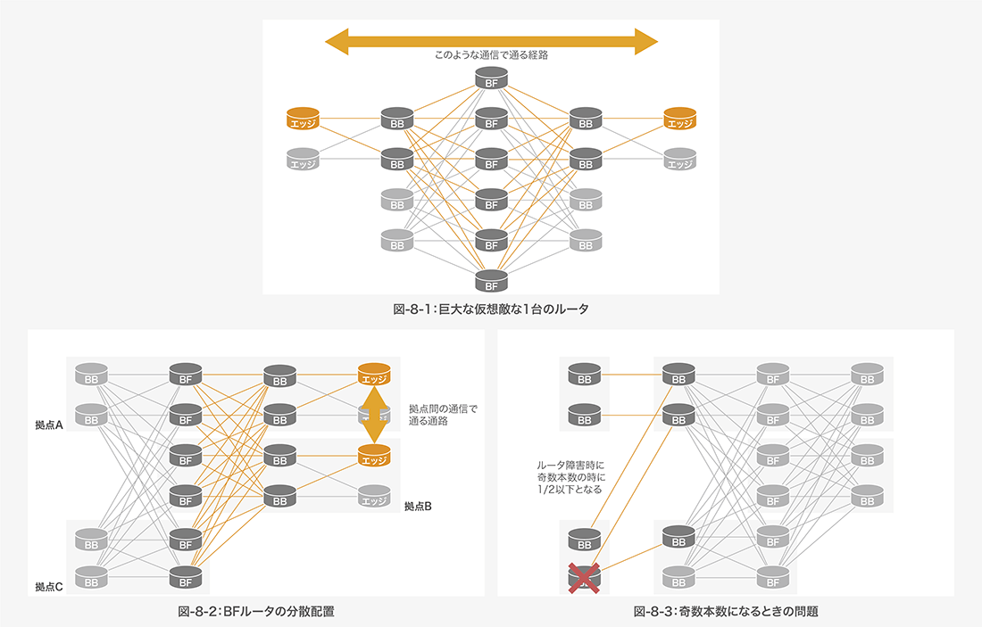 分散配置の回線の問題が解決した次に、このルータ群と各拠点との回線の設計に入りました。今までの回線設計である1+1冗長では非常に多くの回線が必要となるためN+1冗長にしてコスト削減を検討しますが、奇数本数になるときの分散させる方法が非常に難しく、良い方法が見つかりませんでした(図-8-3)。結局3ステージファブリック構想は一部諦めて、東阪など主要拠点間はBFルータ同士をつなぐことでN+1冗長とすることにしました。BFルータ間で接続したために、BBルータから入ってきたトラフィックがどの東阪の回線を使ってどれくらい流れているかなどを明確にしなければ、障害やメンテナンス時のトラフィックの迂回や増強計画が立てられないという非常に難しい問題を生むことになります。この問題を解決するにはnetflowによる解析しかなく、解析に時間がかかってしまうと万一突発的なトラフィックが発生したときに対応できません。丁度、このときに分散システムによって高速な解析ができるシステムを独自開発(注5)していたことによって、障害やメンテナンスによる輻輳を発生させることがありませんでした。結局、4年耐えられる設計としていましたが、倍の8年間設計を変えることなく増強し続けることができました。