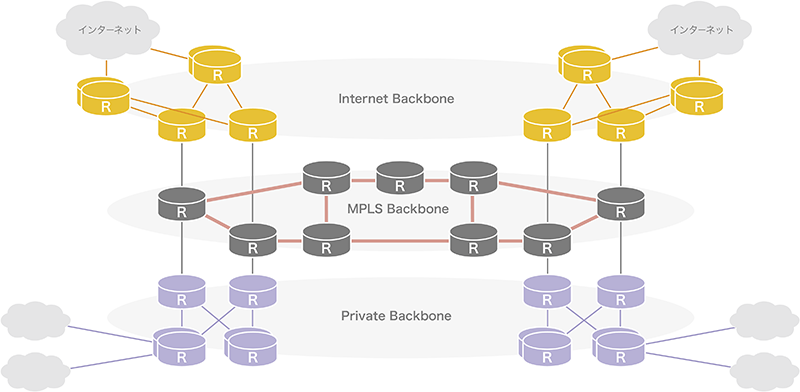 この頃になると既にAWSやGCP、Azureなど、そしてIIJでも「IIJ GIO」としてクラウドサービスを開始しており、クラウドサービスが本格化していきます。それに伴いインターネットトラフィックとは隔離された閉域の拠点間通信の需要が大きくなり、インターネットバックボーンとは別にプライベートバックボーンとしてMPLS/L3VPNを利用して拠点展開していくことになります。