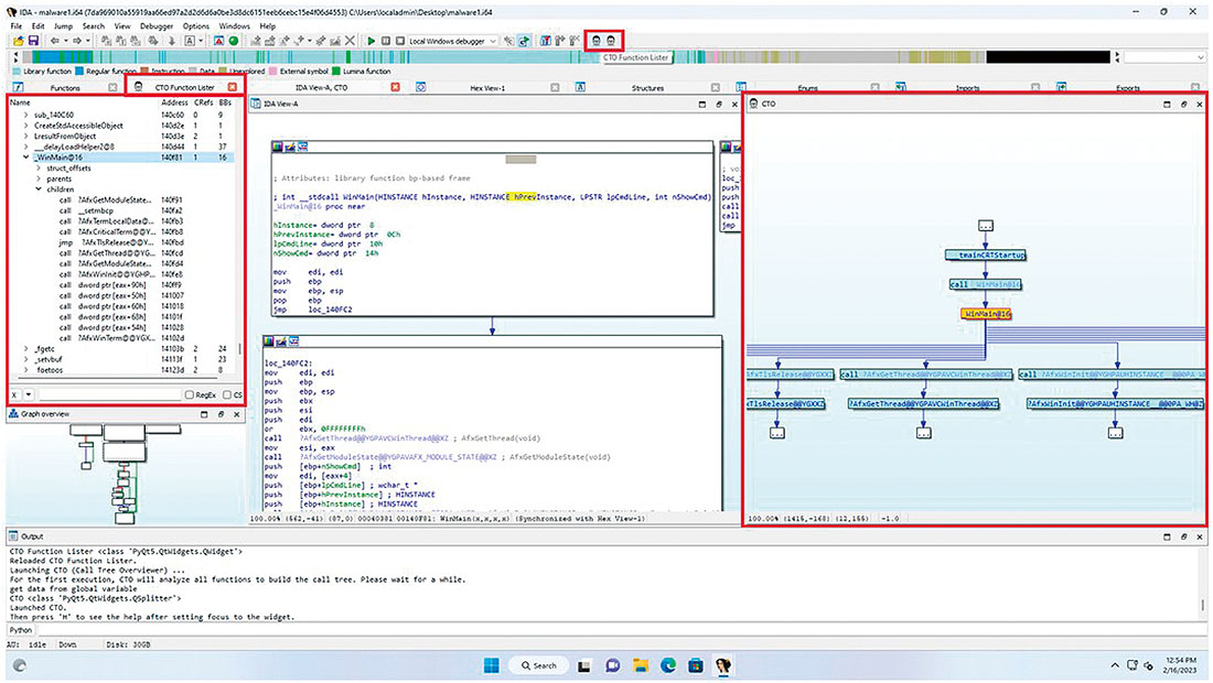 CTO、CTO Function Listerは共にIDA Pro(注2)上でプラグインとして動作します。起動はEditメニューのPlugins、ツールバーのボタン、ショートカットキーのいずれかから行うことができます。図-1では、IDAウィンドウのツールバーの右端に中年男性風のアイコンがあるのが見えます。これらがCTOとCTO Function Listerのアイコンです。これらをクリックすることでウィンドウの左側にCTO Function Listerが表示され、右側にCTOが表示されます。CTOは主に関数呼び出しの親子関係を可視化するツールです。CTO Function Listerは関数一覧や、それぞれの関数が持つ特徴を抽出して保持し、フィルタリング機能でそれらの情報を一括検索するのが主な機能になります。図中では、それぞれのツールがIDAの逆アセンブルビュー(IDA View-A)で表示している"_WinMain"関数(正確にはMFCのAfxWinMain関数)のアドレスと同期し、そのアドレスの情報を各々表示しているのが分かります。