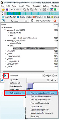 結果はOutputウィンドウにも表示されますが、CTO Function Lister上で該当関数のみにフィルタして表示することも可能です。それを行うためには図-3のとおり、再度ドロップダウンメニューを開き、"Preset filters"、"xor instruction in a loop"を選択します。