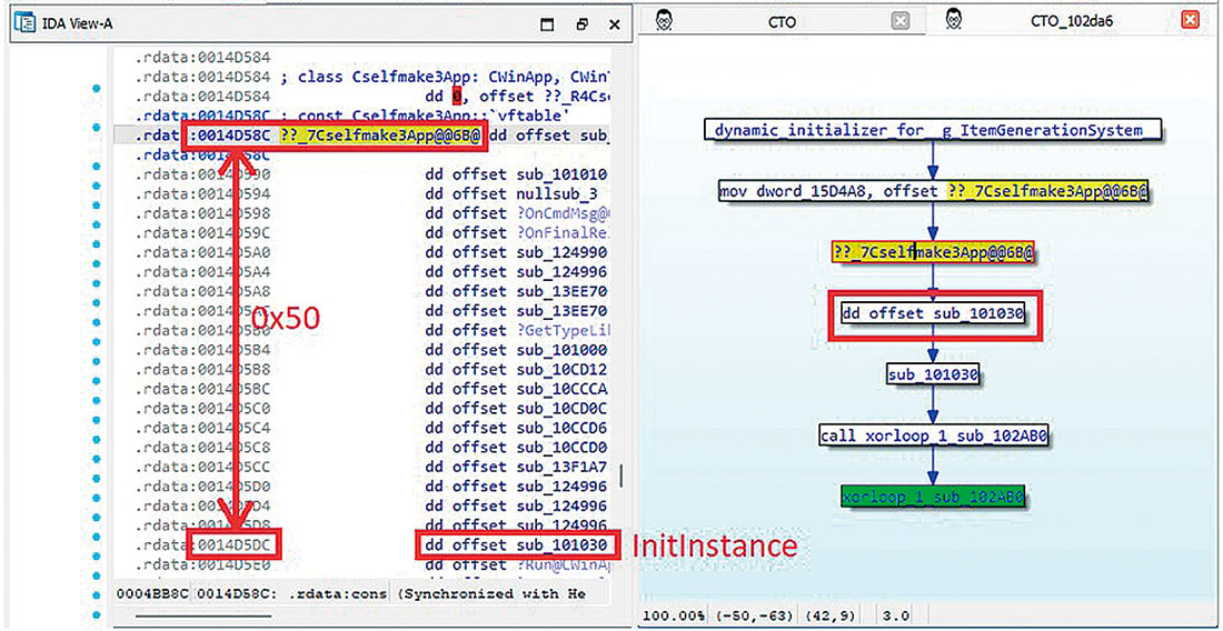 次にCselfmake3Appのvftableは、sub_101030という関数と接続しています。CTOは、関数内に存在するグローバル変数へのアクセスを抽出してキャッシュとして持っています。特にその中でも変数名の先頭やそのアドレスに付与されたコメントの最後にvftableやvtableという文字列を発見した場合、そのグローバル変数をvftableとして扱ってテーブルをパースし、一定の法則に従って関数ポインタ群をそのvftableに属するものであると認識します。IDAはRTTIを認識することが可能なため、このアドレスのコメントにvftableを含む文字列が付与されます。よってCTOの初回実行時にvftable解析処理が実行され、CTO内でsub_101030がこのvftableの一部であると認識済みです。そのためvftableに属する関数へのアクセスが発生すると、CTOはこのようにこの関数ポインタを仮想メソッドとして接続できるのです。図-6は、Cselfmake3Appのvftableのノード(上から3番目の「??_7Cselfmake3App@@6B@」)をCTO上でクリックしたときのIDAの画面を表示したものです。「IDA View-A」ではvftableの先頭から関数ポインタが連続していますが、先頭から0x50の位置にsub_101030があることが分かります。ちなみに、32-bitのMFCメインアプリケーションクラスでは、vftableの0x50にInitInstanceという仮想メソッドが存在します。つまり、sub_101030はInitInstanceです。