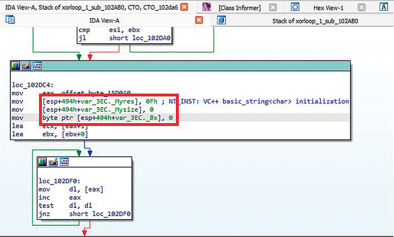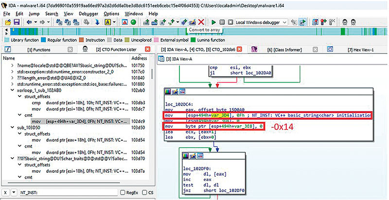 例として、マルウェアによってデコードされたコンフィグデータをパースしていくコードで使われていたstd::stringを見ていきます。図-7はCTOで検出したstd::stringの初期化部分のコードを表示したものです。図中1つ目の赤枠では、即値0xfでスタック変数が初期化されているのが分かります。これは、Visual Studioのstd::stringで長年使われている初期化コードの一部です。その2命令下(2つ目の赤枠)には、1バイト分のNULL文字でバッファの先頭部分(前述の0xfで初期化したアドレスより-0x14の位置)を初期化しているコードも見えます。これらがセットで存在した場合、筆者はstd::stringであると判断して構造体を適用するようにしています。