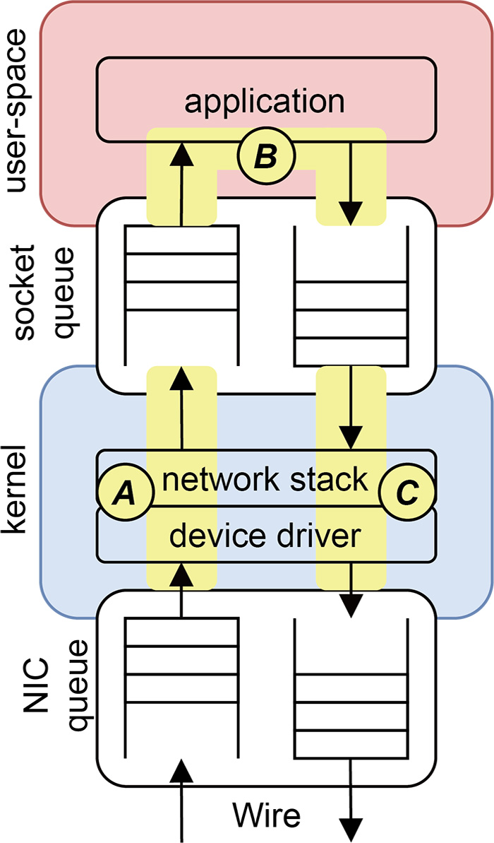 サーバと呼ばれるような、クライアントのリクエストに対して応答を返すようなプログラムは典型的にA:カーネル空間での受信処理、B:ユーザ空間でのアプリケーション固有の処理、C:カーネル空間での送信処理のループになります。