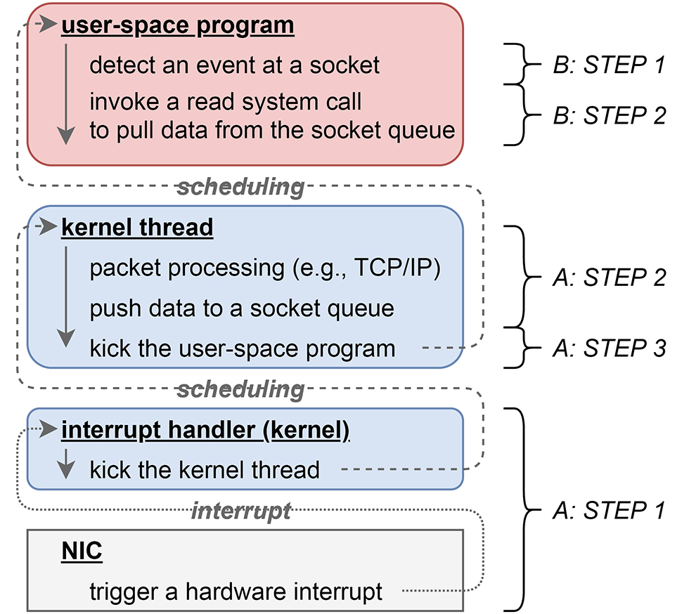 2010年代初頭より10Gbpsを超えるような速度のネットワークインタフェースカード(NIC)が一般化し、データセンターなどで広く利用されるようになりました。NICの性能向上により、それらハードウェアを制御するシステムソフトウェアと呼ばれるようなソフトウェアの、特に通信に関する処理の効率の重要性が高まり、研究コミュニティにおいては性能の改善を目指した取り組みが数多く行われてきました。