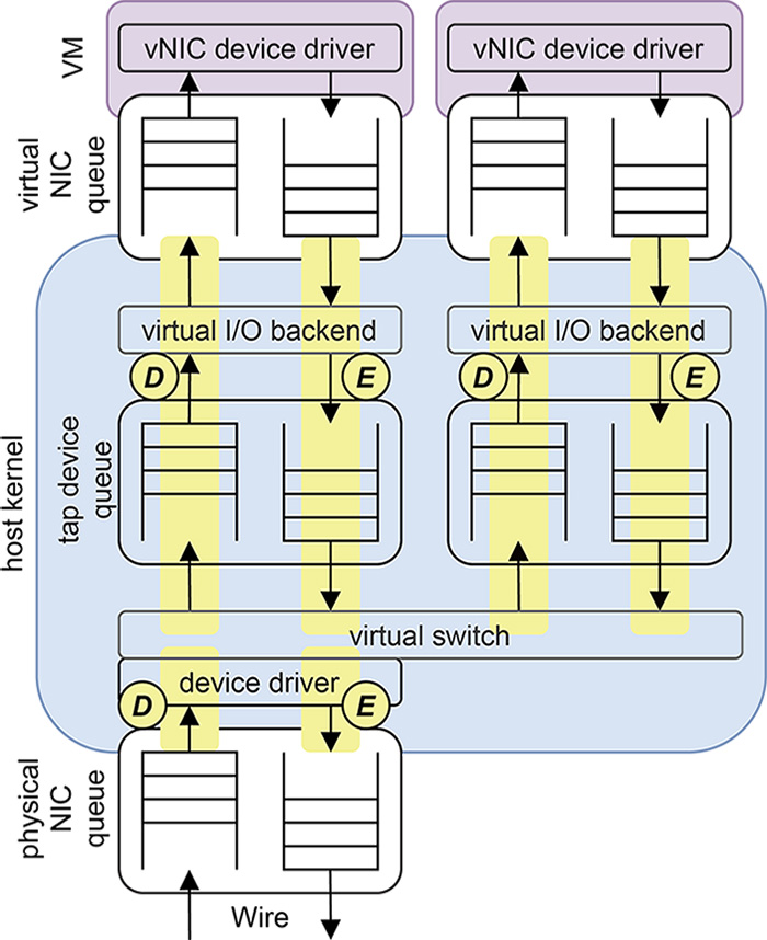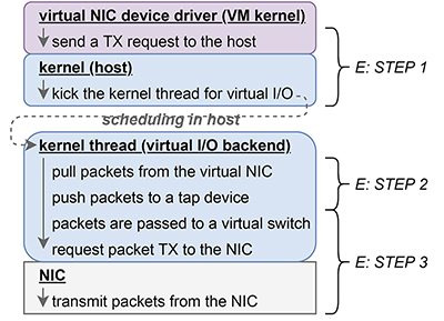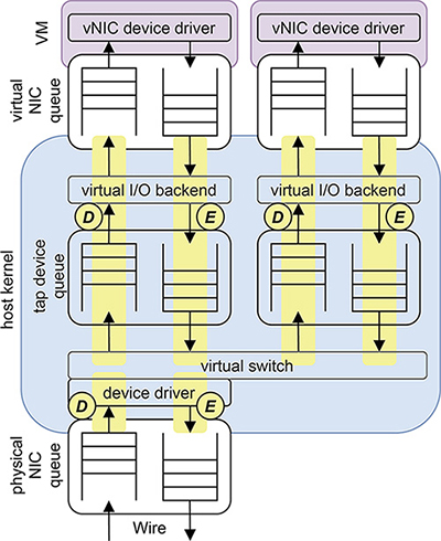 前掲の図-4にあるように、仮想マシンの通信においては、物理NICにおけるパケット入出力を多重化する仮想スイッチと、仮想NICのエミュレーションを担当するバックエンドが主なソフトウェアの構成要素となっています。本節では、これら2つの最適化に向けた取り組みについて見ていきます。
