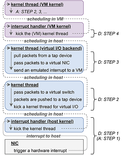 仮想マシン上で、前節で述べたような、受信したリクエストに対して返信するといったプログラムが動作している場合、仮想マシン環境では典型的に、D:ホスト内での仮想マシン通信の受信処理、前述A~C:仮想マシン上で、汎用OSによる通信関連の処理(注2)、E:ホスト内で仮想マシン通信の送信処理のループが実行されます。