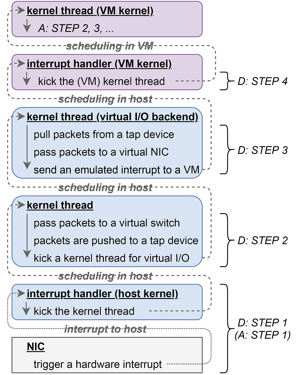 - 物理NICにパケットが到着したときの最初の処理は、前述Aのステップ1と同じで、ホストカーネル内でハードウェア割り込みハンドラが起動し、受信パケットを処理するためのカーネルスレッドが起動されます。