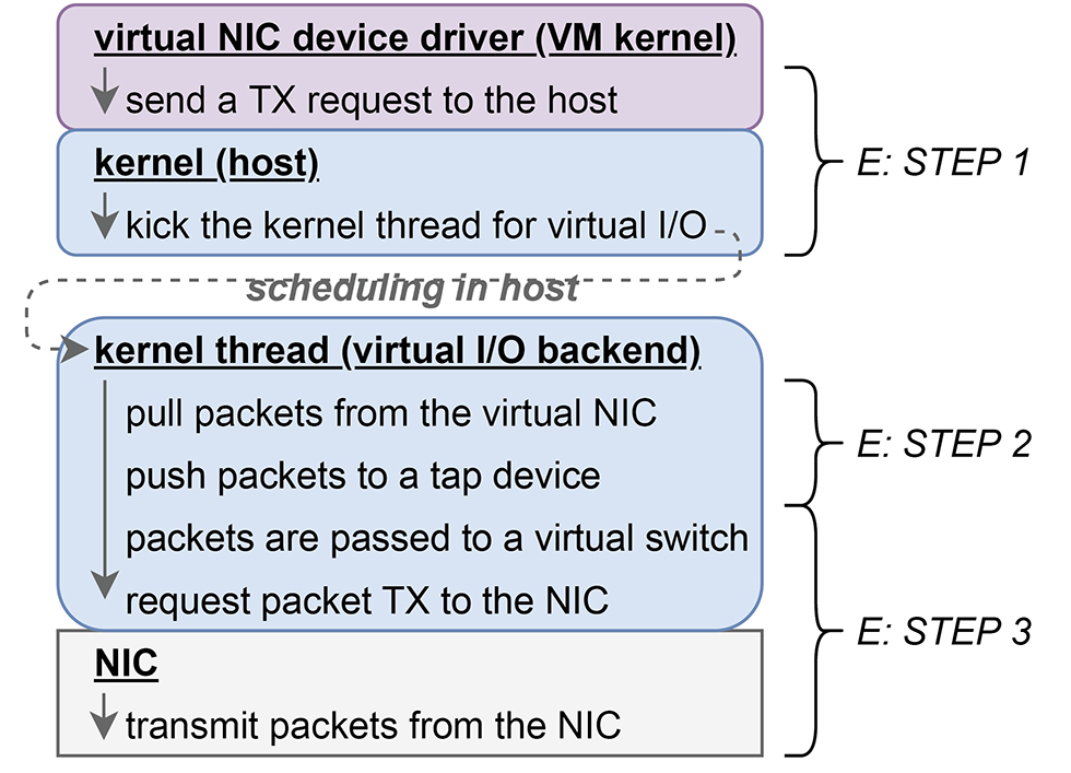 - 仮想マシンが前述Cのステップ3を実行して仮想NICデバイスドライバを通して、送信したいデータを仮想NICの送信キューへ追加した後、仮想NICに対してパケット送信をリクエストすると、実行のコンテキストが仮想マシンからホストのカーネルへ切り替わり、その中で仮想I/Oを担当するカーネルスレッドが起動されます。