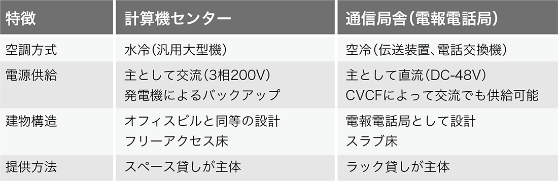 表-1 計算機センターと通信局舎の特徴的な違い