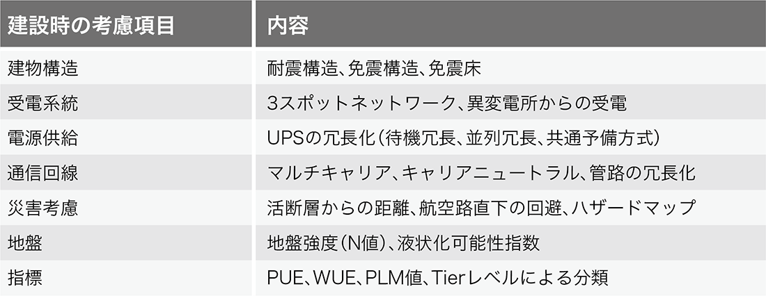 表-2 データセンター建設時の考慮事項