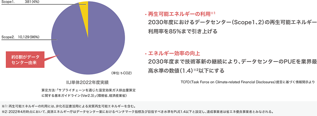 IT機器を集約し効率的に運用するデータセンターの利用は、社会全体の省エネに貢献する一方、施設自体のエネルギー消費が注目されています。2023年に改正省エネ法が施行され、データセンター業にベンチマーク制度(PUE1.4以下)が導入されたことに加え、新たに非化石エネルギーへの転換計画の提出も義務付けられました。また、東証プライム上場企業にTCFD提言に基づく気候変動リスクの情報開示が実質的に義務化されたこともあり、データセンターのカーボンニュートラル化は喫緊の課題となっています。IIJにおいても、温室効果ガス排出量(Scope1、2)(注1)の約8割をデータセンターが占めており、「再生可能エネルギーの利用」と「エネルギー効率の向上」への目標を設定し取り組んでいます(図-2)。
