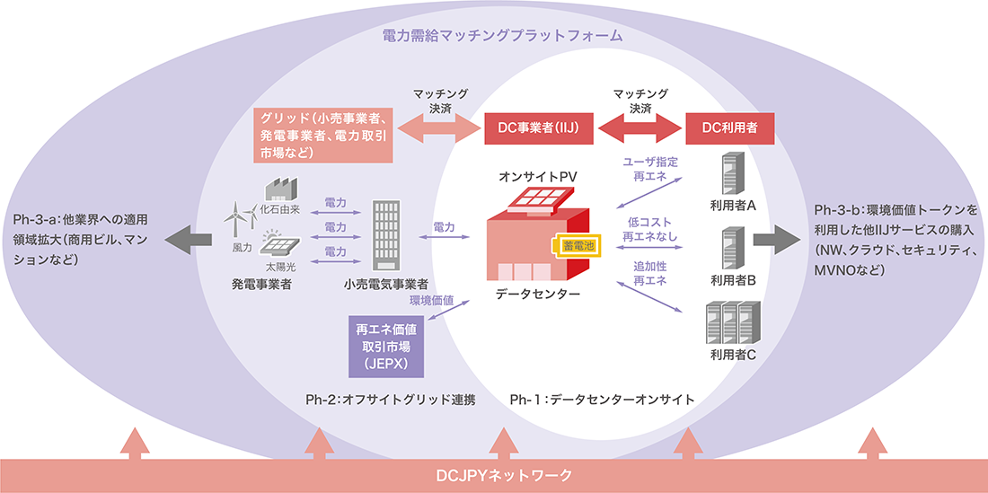 「再生可能エネルギーの利用」は電力の「量」に加え、CO2を排出しない「発電種別」を意識する新たな取り組みです。IIJデータセンターでは、納期、コスト動向などにより各調達手法を評価し、複数の手法を組み合わせることで、早期に再エネ率を高めつつ、追加性の高い電力比率の向上、調達コストの安定化を図っています(図-3)。これまでに、一般社団法人日本卸電力取引所(JEPX)の「再エネ価値取引市場」に加入し市場から直接証書を調達したり、データセンター敷地内に太陽光発電設備を導入することで再エネ調達コストの低減を実現してきましたが、従来からの省エネ性の追求と合わせオフサイト電力の調達などによりカーボンニュートラルの達成を目指しています。そしてこれらのリソースを活用し、データセンター利用者へ環境価値を提供する新サービスを開始(2023年10月)しました(図-4)。2024年7月には、環境価値をデジタルアセット化(トークン化)して提供する計画で、環境価値取引のビジネス開発につながる取り組みも進めています(図-5)。また、データセンター内の蓄電池を利用したVPP(バーチャルパワープラント・仮想発電所)事業への参画(2023年度〜)や、環境省が進める脱炭素先行地域に島根県松江市の共同提案者として参画し災害時に蓄電池による地域への電力供給を計画しており、電力網の安定化やレジリエンス強化といった社会課題の解決に貢献するデータセンターの新たな役割へも挑戦しています。