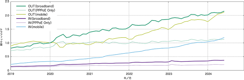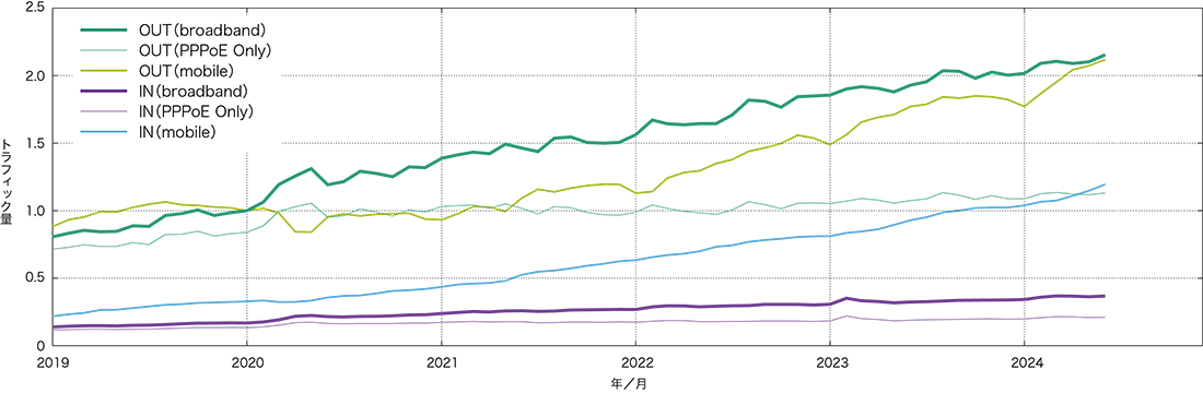 まず、図-1で示した、IIJの固定ブロードバンドサービス全体の月ごとの平均トラフィック量に関してです。2019年6月と2024年6月の5年間の増加を見ると、INで1.72倍、OUTで2.01倍となっていて、年率換算すると1.11と1.15になります。