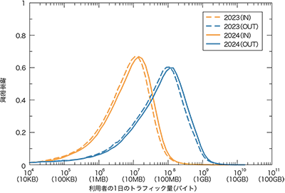 まず、図-3のブロードバンドの分布を見ます。2023年と2024年を比較すると、INとOUT共に分布全体がごくわずかながらも右側に移動していますが、全体的に利用量はほとんど変わっていないことが分かります。