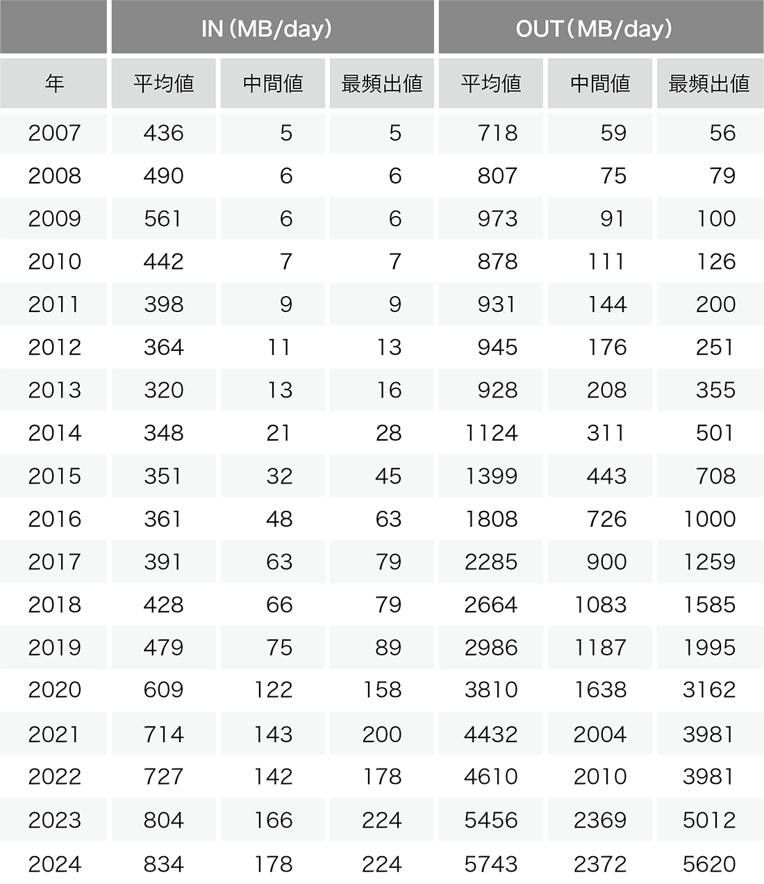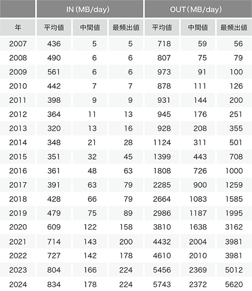 表-1は、ブロードバンド利用者の1日のトラフィック量の平均値と中間値、分布の山の頂点にある最頻出値の推移を示します。分布の山に対して頂点が少しずれている場合は、最頻出値は分布の山の中央に来るように補正しています。分布の最頻出値を2023年と2024年で比較すると、INでは224MBのまま変わらず、OUTでは5012MBから5620MBに増えています。伸び率で見ると、INで1.00倍、OUTは1.12倍となっています。一方、平均値はグラフ右側のヘビーユーザの使用量に左右されるため、2024年には、INの平均は834MB、OUTの平均は5743MBと、最頻出値より大きな値になります。2023年には、それぞれ804MBと5456MBでした。なお、前述のように2020年分まではPPPoE利用者のみの数字で、2021年以降はPPPoE利用者とIPoE利用者を統合した数字になっています。