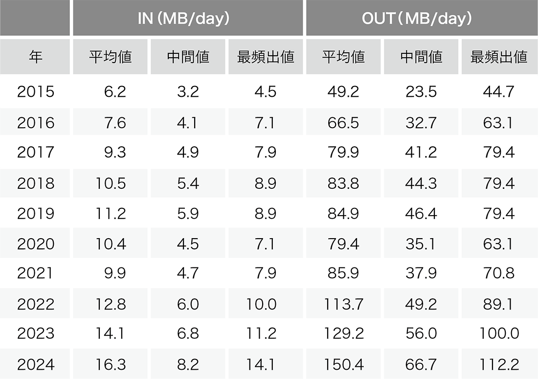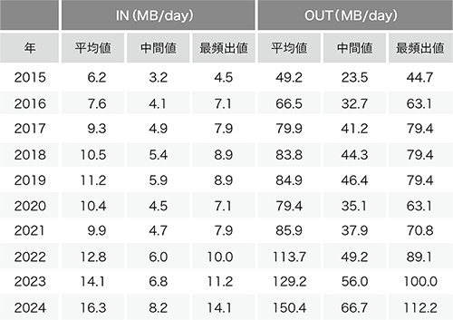 表-2はモバイルの値の推移で、2024年の最頻出値はINで14MB、OUTで112MB、平均値はINで16MB、OUTで150MBです。2023年の最頻出値はINで11MB、OUTで100MB、平均値はINで14MB、OUTで129MBでした。