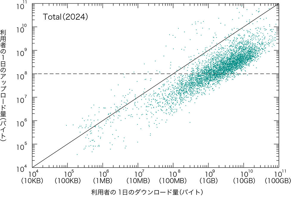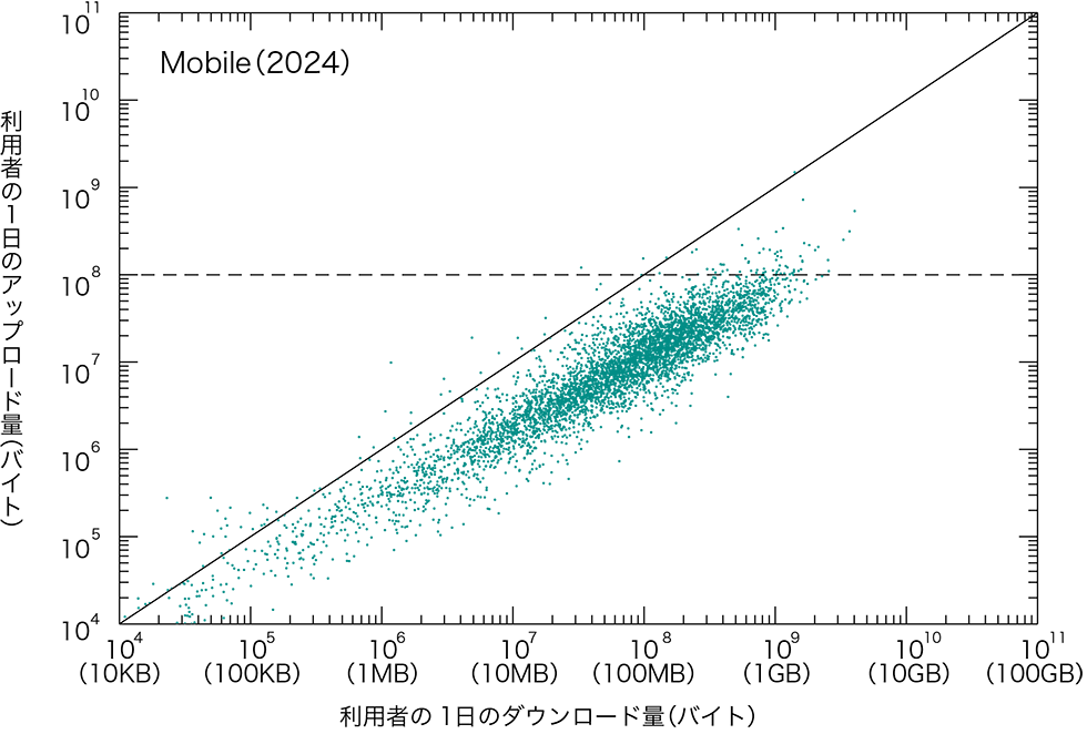 対角線の下側に沿って広がるクラスタは、ダウンロード量がひと桁多い一般的なユーザです。各利用者の使用量やIN/OUT比率にも大きなばらつきがあり、多様な利用形態が存在することがうかがえます。モバイルでも、OUTがひと桁多い傾向は同じですが、ブロードバンドに比べて利用量は大幅に少なくなっています。ブロードバンド、モバイル共に、2023年との違いはほとんどないと言えます。