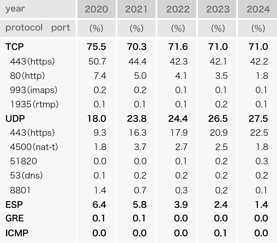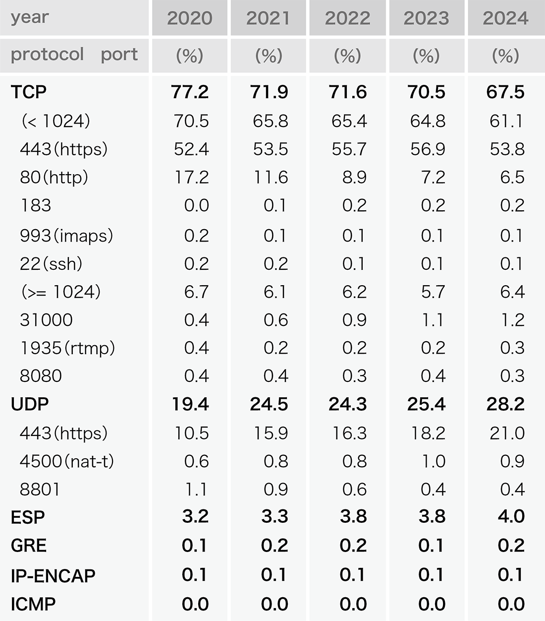 表-3はブロードバンド利用者のポート使用割合について過去5年間の推移を示します。2024年の全体トラフィックの68%はTCPで、昨年から3ポイント減りました。HTTPSのTCP443番ポートの割合は、54%で前回から3ポイント減りました。HTTPのTCP80番ポートの割合は7%でわずかながら減っています。QUICプロトコルで使われるUDP443番ポートは、21%で3ポイント増えました。