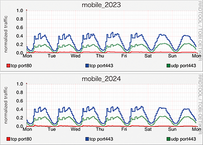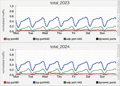 図-8のモバイルでは、トラフィックの大半を占めるTCP80番ポートと443番ポート、UDP443番ポートについて推移を示します。2023年と比べると、ブロードバンドと同様にUDPポート443番が少し増えています。ブロードバンドに比べると、平日には、朝の通勤時間、昼休み、夕方と3つのピークがあるなど利用時間の違いがあります。